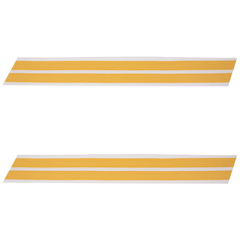 Army male service stripe gold embroidered on white set of 2. Worn only on the Army White Evening Mess Dress Uniform.