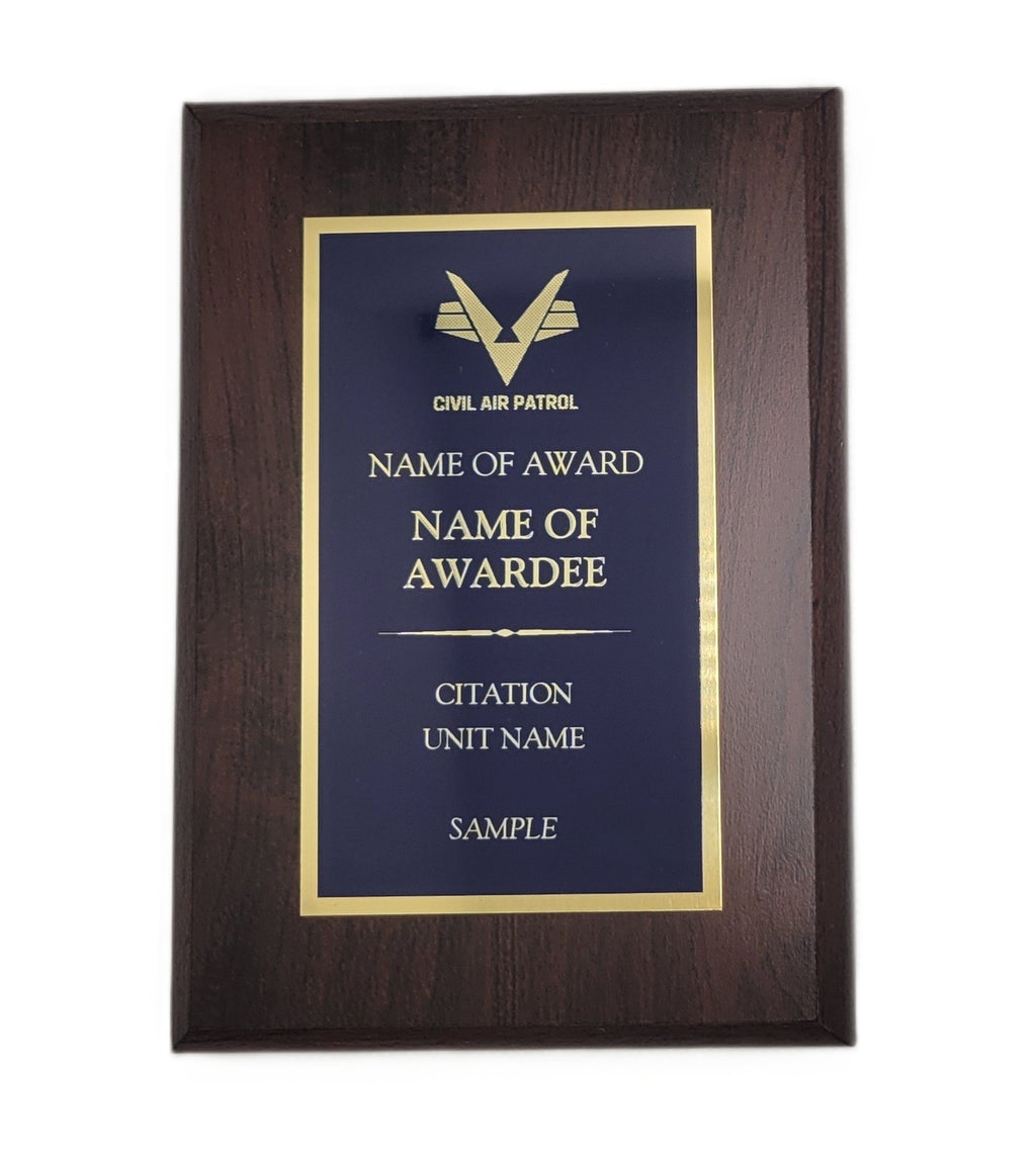 Gold border around a Blue plate mounted on a cherry wood plaque with Civil Air Patrol Flying V, brass plate AND the engraving is included in the pricing. There is a 10 - 21 business day time-frame. Please choose your size plaque.