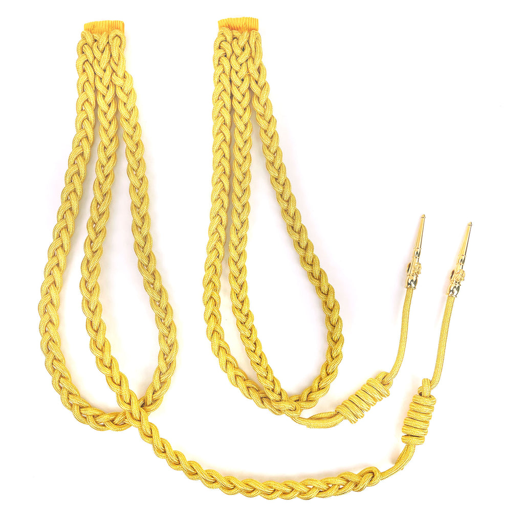 Army aiguillette : dress uniform: synthetic gold tubular w/ 2 brass tips. Safety Pin attachments for wearing.