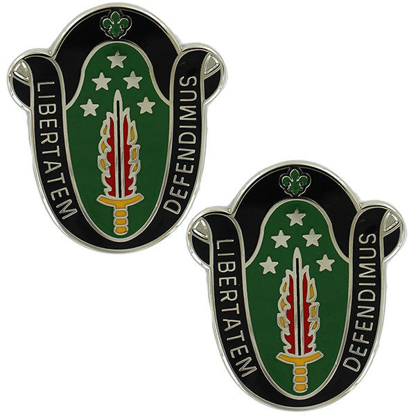 Army Crest - 20th CBRNE Chemical, Biological, Radiological, Nuclear, Explosives Command motto: Libertate Defendimus - priced per pair.