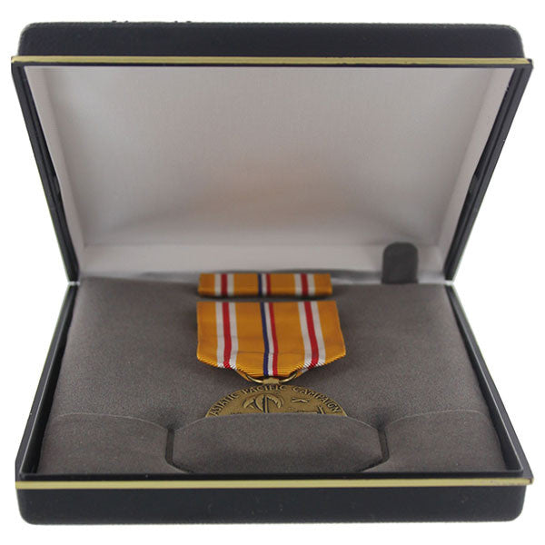 Full size medal presentation set for the Asiatic Pacific Campaign (APCM) Award. The set includes a full size medal and ribbon unit mounted on a single base bar with clutch backs in a presentation case. Priced per set.