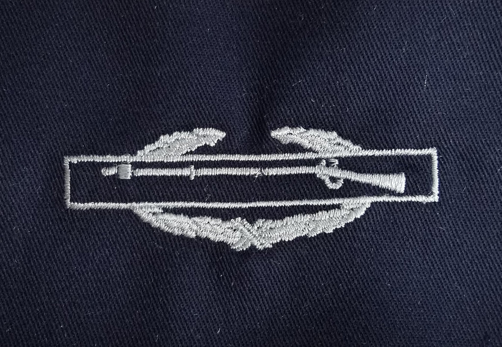 Combat Infantryman badge cloth embroidered in silver on dark blue background. For wear on BDUs, ABUs and cap field uniform.