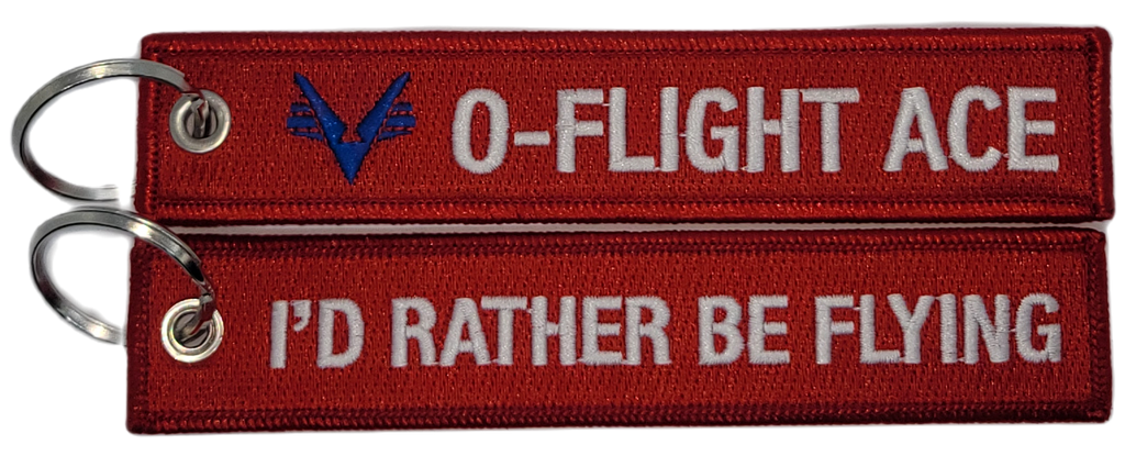 Civil Air Patrol: Red Key Chain, two-sided, 6" wide x 1 1/8" tall. I'd rather be flying/O-Flight Ace is embroidered in white embroidery and Flying V embroidered in blue on the keychain.