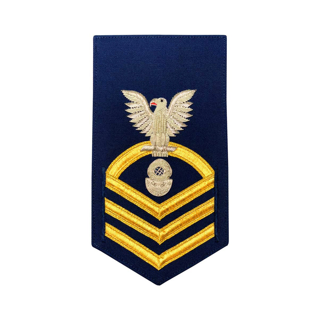 Coast Guard rating badge E-7 Vanfine bullion eagle and shield with gold lace chevrons on blue - individually priced. Please allow 2-4 weeks for delivery.