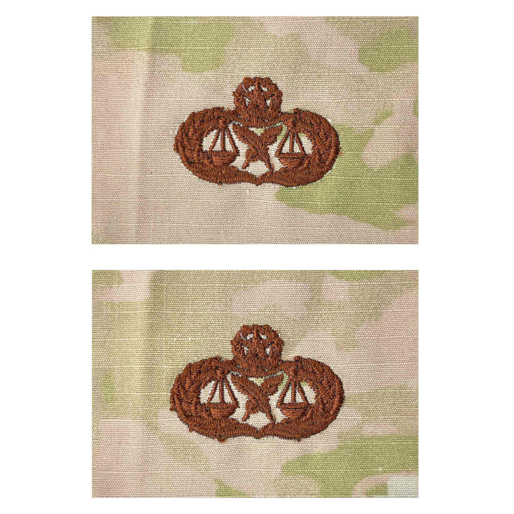 Air Force 3-Color OCP uniform Master paralegal badge embroidered. Awarded to enlisted personnel ONLY who are assigned to the paralegal career field after completion of the paralegal course at the JAG school at Maxwell AFB, Alabama. The scales of justice represent the military legal system and quills represent the support given by the paralegal force.
