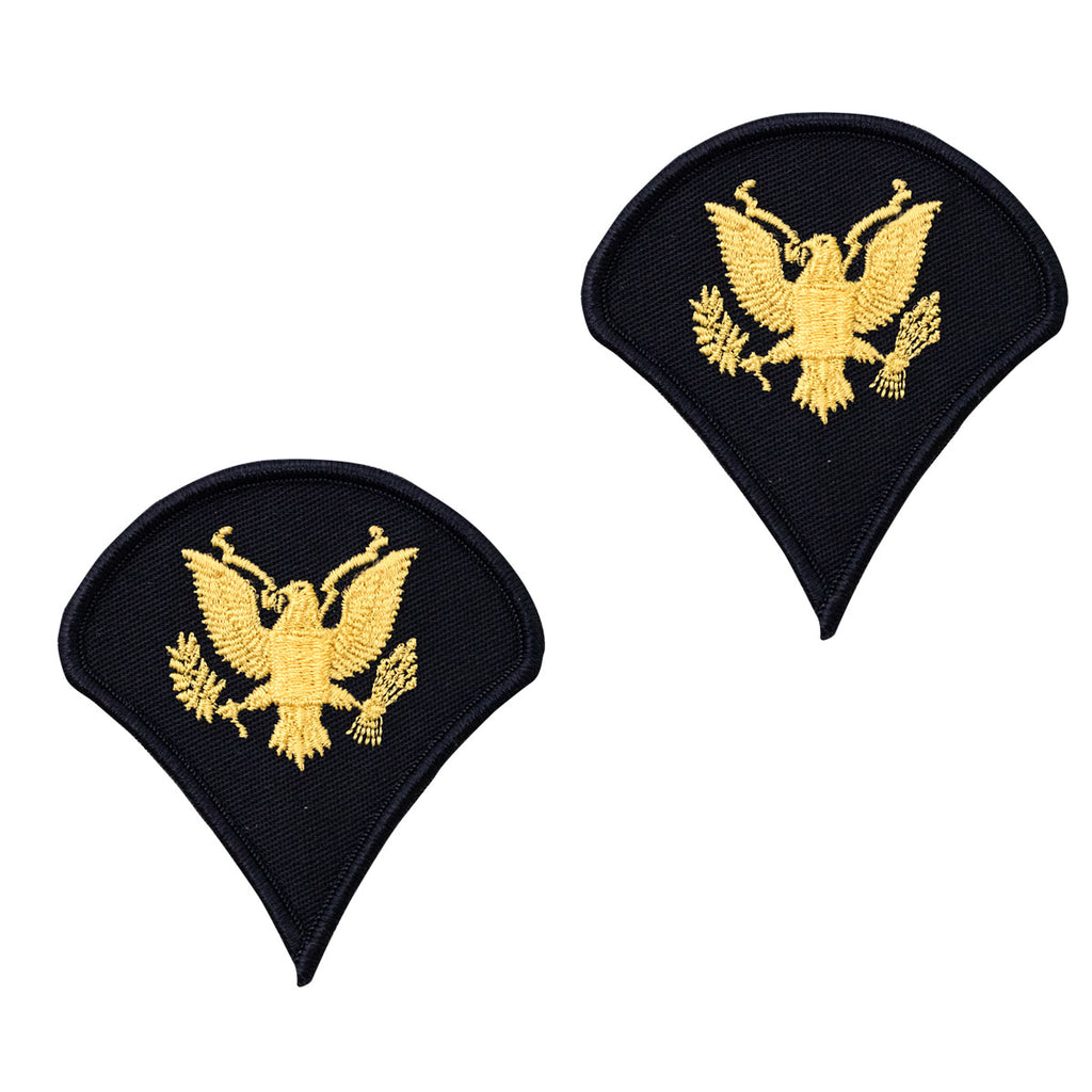 Army chevron rank: large (male size): gold embroidered on blue: Enlisted: Specialist (E-4 / SPC / OR-4) - Price per pair.