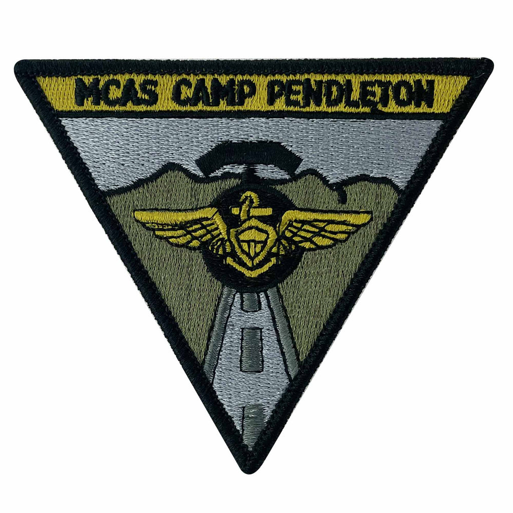 United States Marine Corps (USMC) shoulder patch Marine Corps Air Station Camp Pendleton - subdued with Heat Seal Backing. While not currently worn on the Marine Corps uniforms these patches are a way to support a particular United States Marine Corps (USMC) unit.