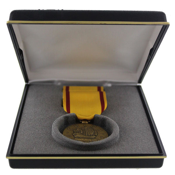 Full size medal presentation set for the Navy China Service award.  The set includes a full size medal and ribbon unit mounted on a single base bar with clutch backs in a presentation case. Priced per set.  Please allow an additional 7-10 days for production.