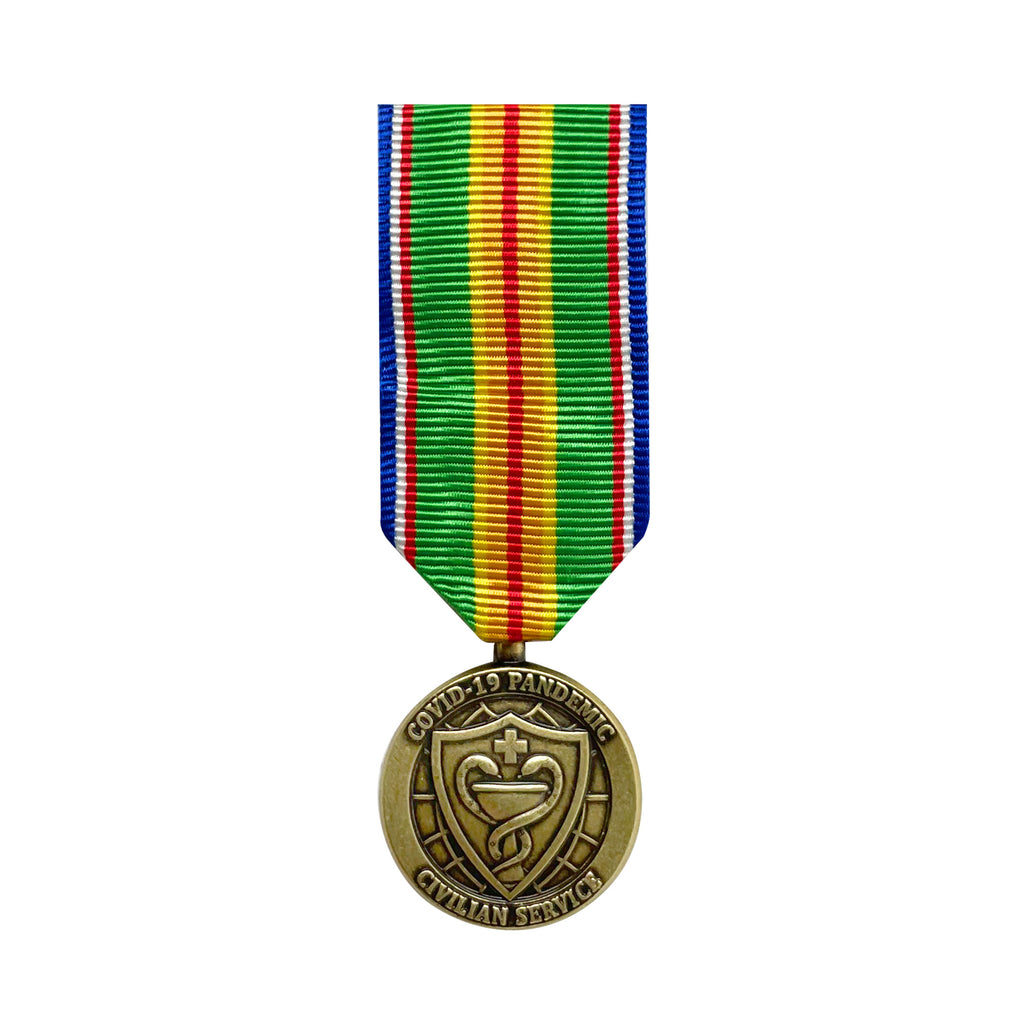 Miniature medal for the PHS Covid-19 Pandemic Civilian Service Medal. Individually priced. Mounting bar sold separately.