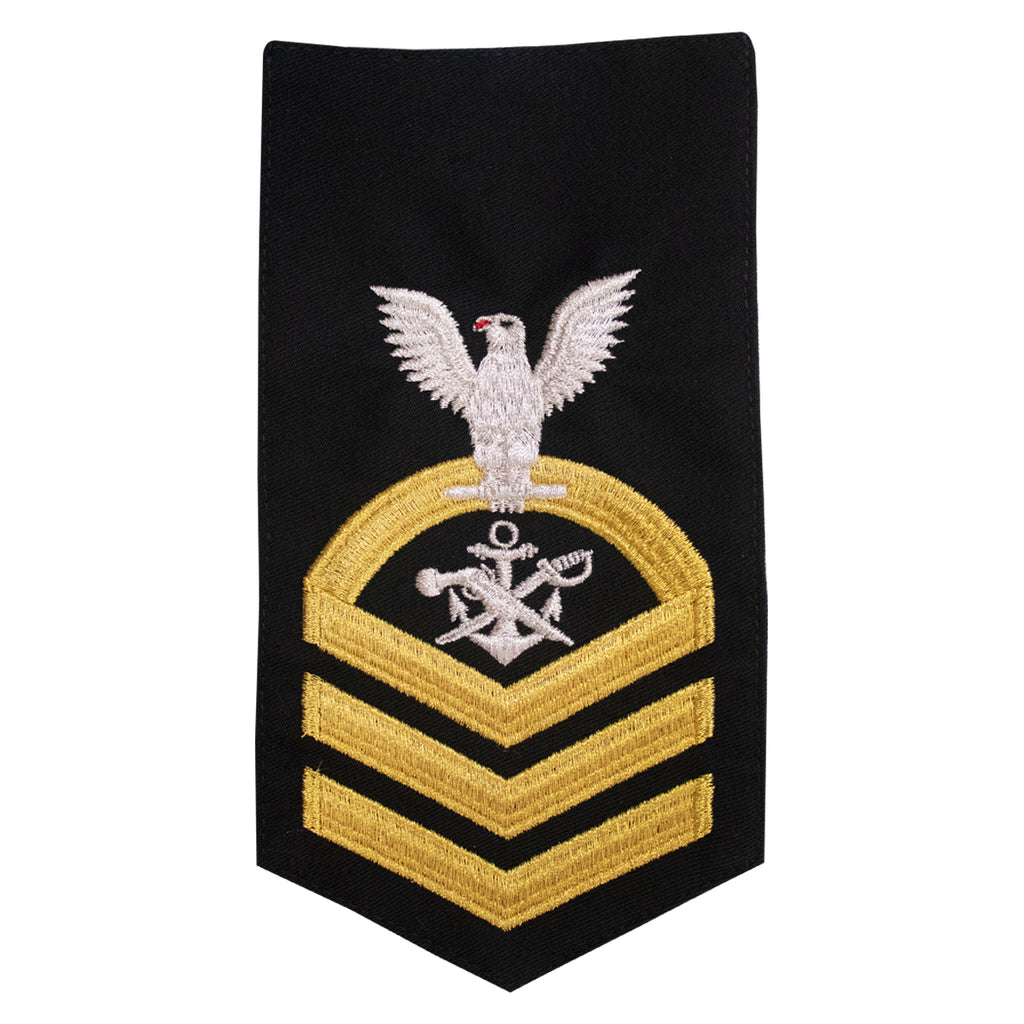 Navy rating badge E-7 seaworthy-all machine made eagle and center with embroidered gold embroidered on blue SB Special Warfare Boat Operator.