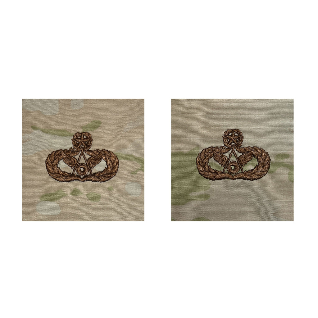 Air Force 3-Color OCP uniform Master Civil Engineer badge embroidered. Master Occupational badge is awarded after 15 years for officers and to E-7s or above who have performed at the craftsman skill level for at least 5 years.