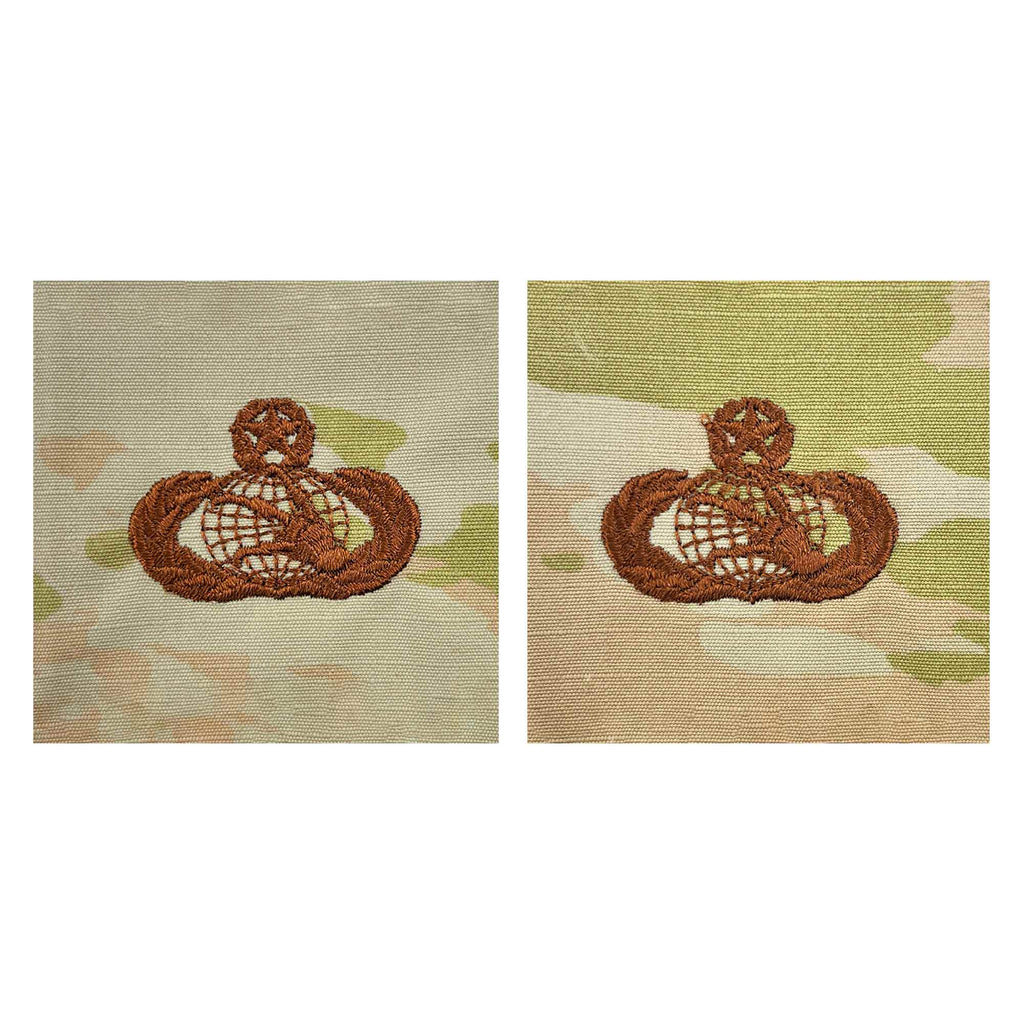 Air Force 3-Color OCP uniform Master Communication and information badge embroidered. Authorized in 1993 and awarded to both officers and enlisted personnel in the communications-computer systems career field and to enlisted personnel in the visual information career field. In 1997, the communications career field merged with the information management career field. The badge design did not change.