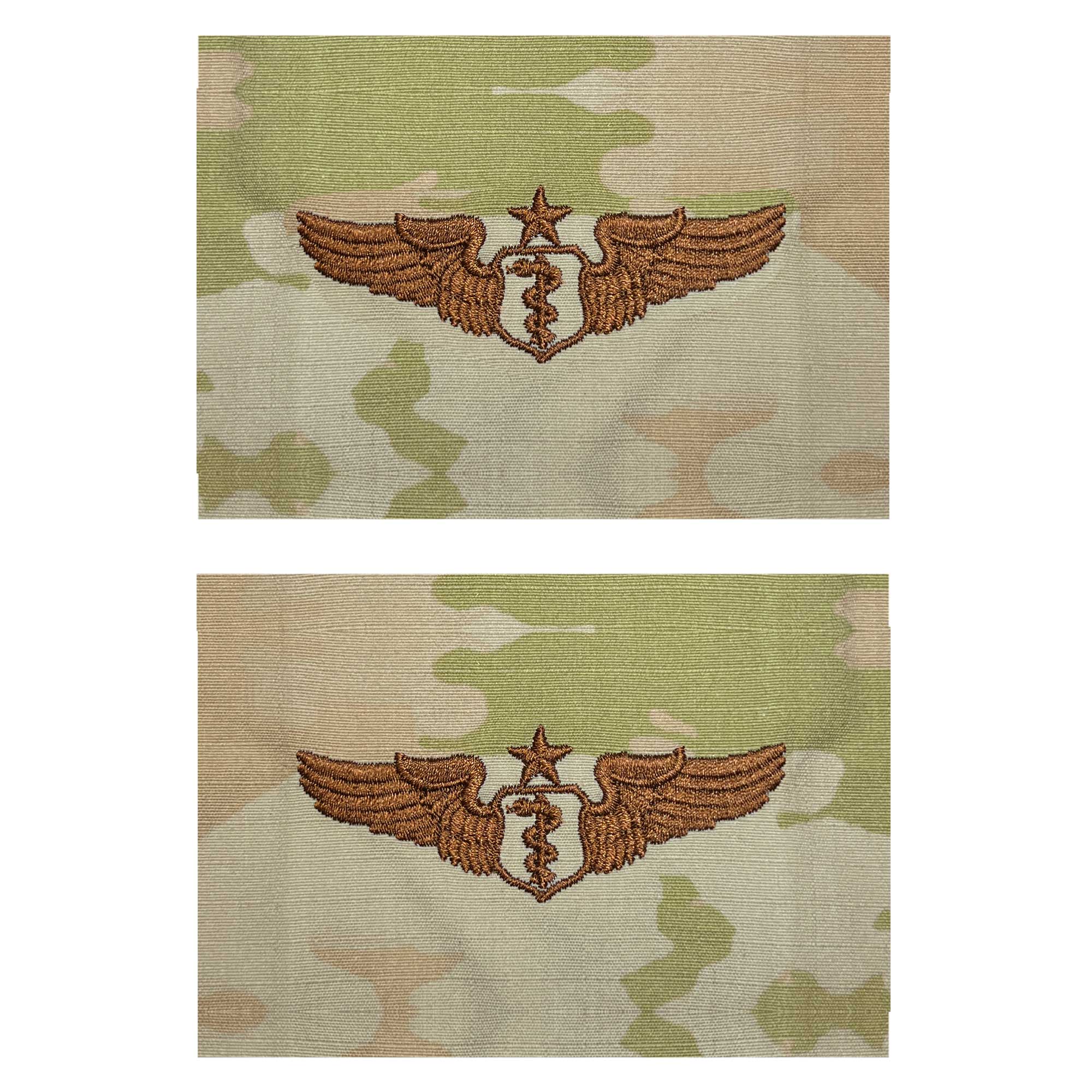 Air Force 3-Color OCP uniform Senior Flight Surgeon badge embroidered. Requirements for the Senior Flight Surgeon badge were 7 years total service and 350 flying hours logged as a flight surgeon.