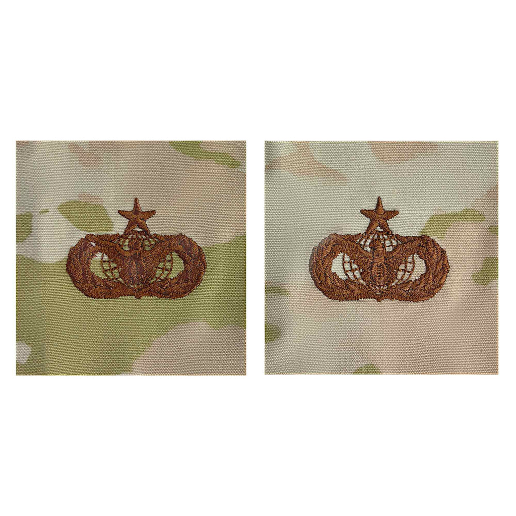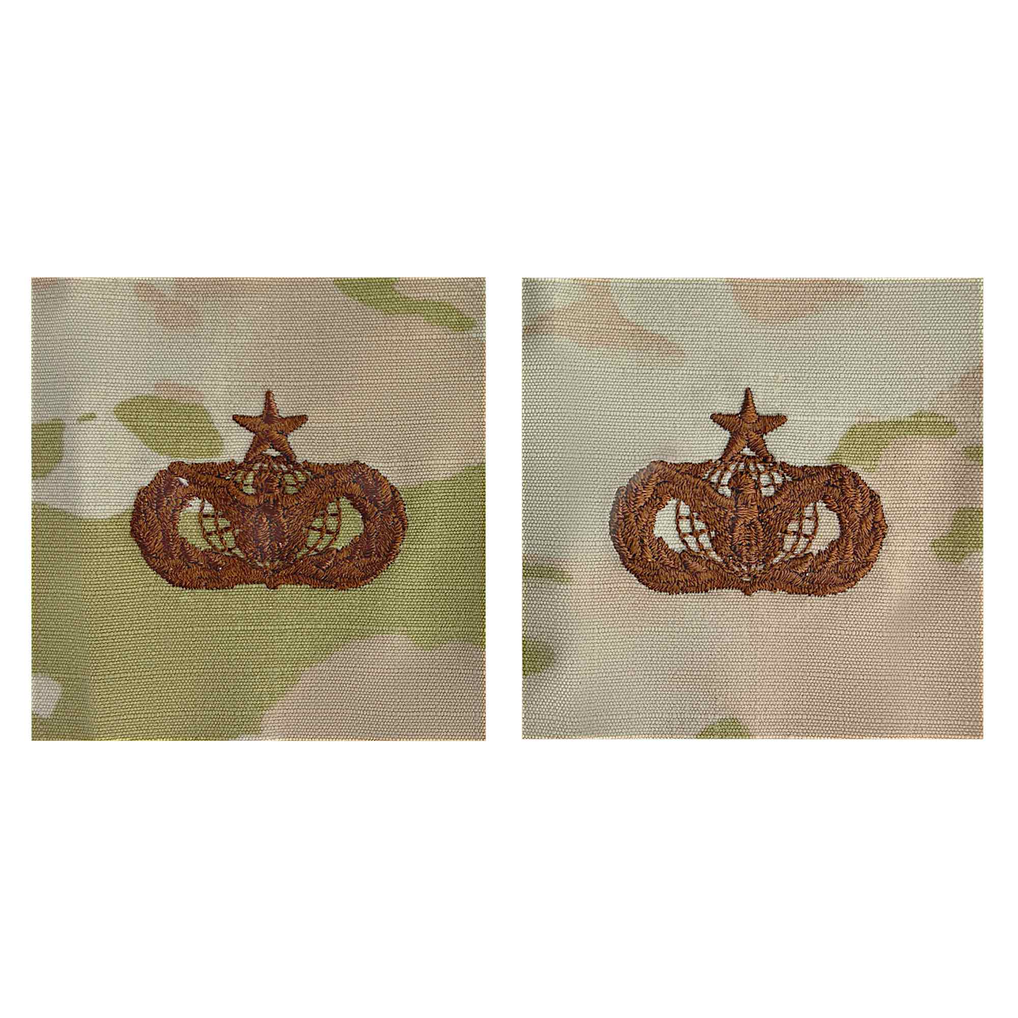 Air Force 3-Color OCP uniform Senior Force Protection badge embroidered. Awarded to both officers and enlisted personnel assigned to either the security police or the special investigations career fields. Replaces the security police qualification badge which became obsolete in 1998. The law enforcement career field is responsible for providing security for state laws, maintaining the installation correction facility, conducting investigations, and maintaining an effective anti-terrorism program.
