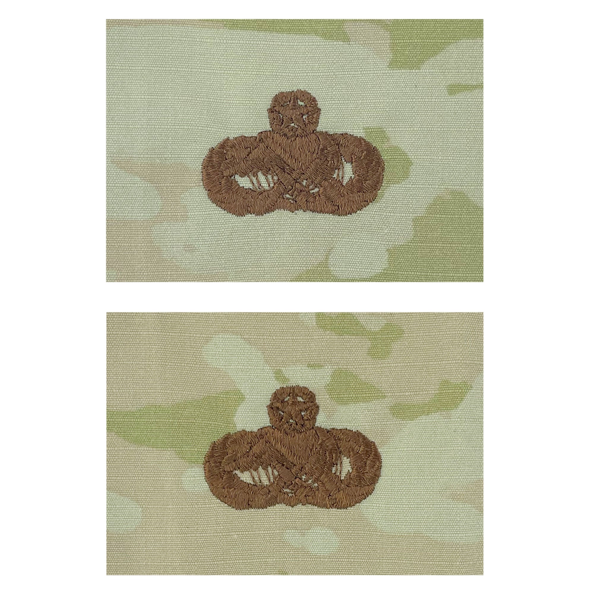 Air Force 3-Color OCP uniform Master Logistics badge embroidered. Master badge is awarded after 15 years for officers and to E-7s or above who have performed at the craftsman skill level for at least 5 years.
