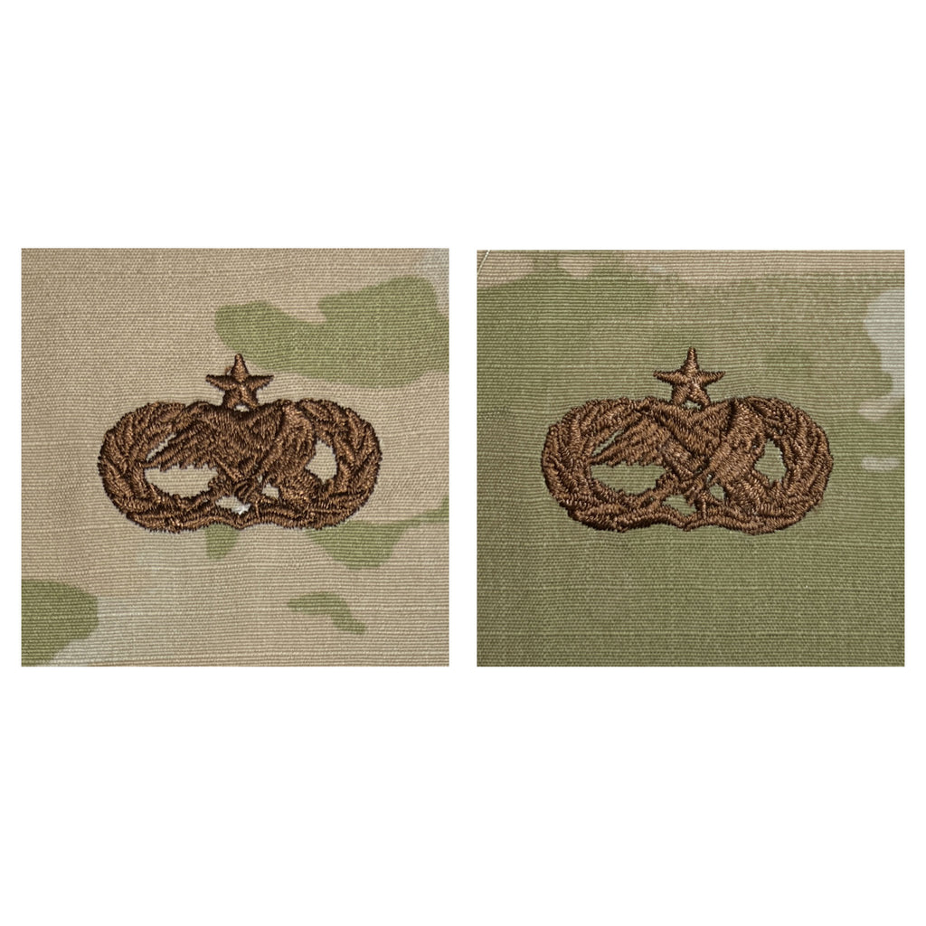 Air Force 3-Color OCP uniform Senior maintenance badge embroidered. Enlisted wear the basic badge after award of the 5-skill level, the senior badge after award of the 7-skill level and the master badge after award of the 9-skill level.
