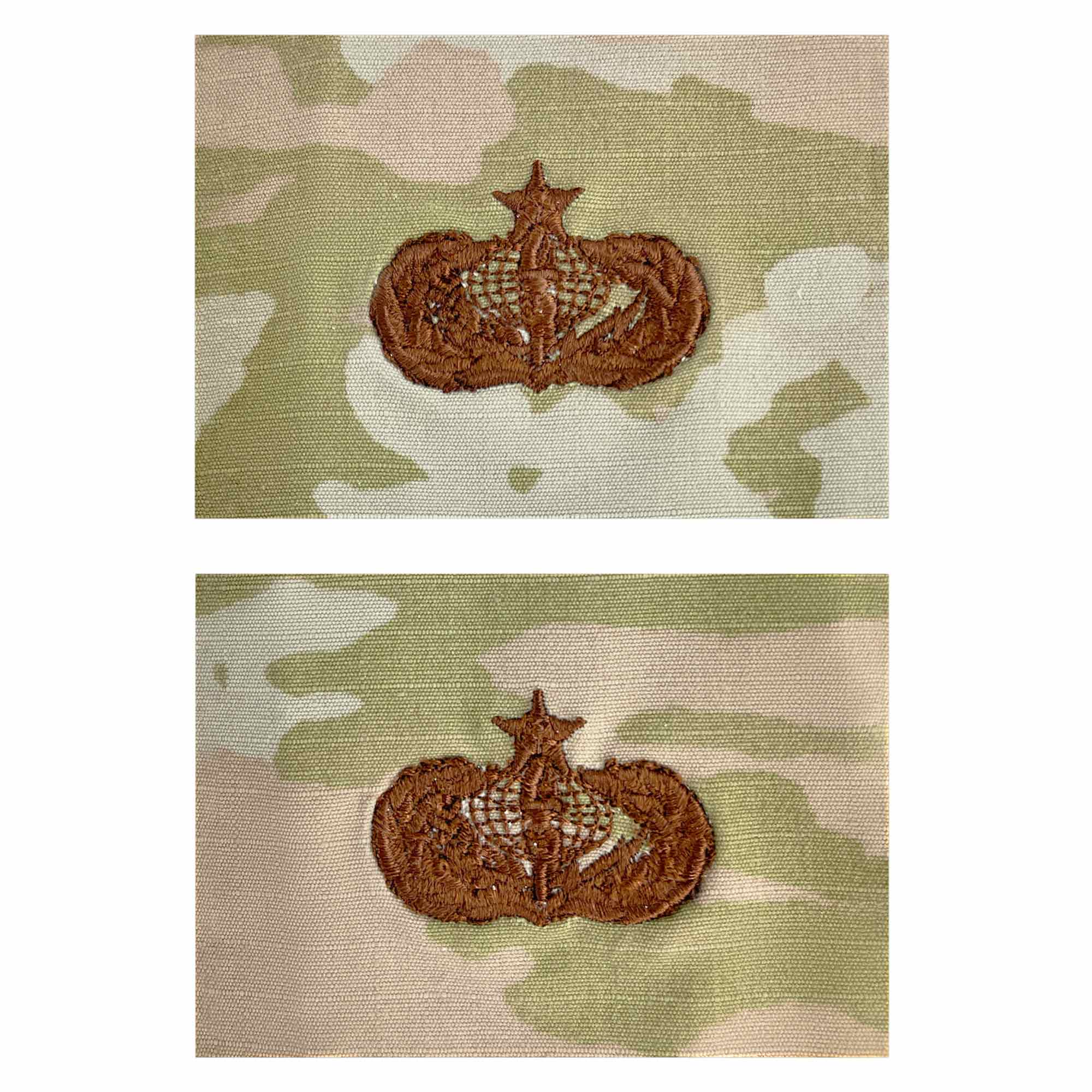 Air Force 3-Color OCP uniform Senior services badge embroidered. Authorized in 1993 and awarded to both officers and enlisted personnel in the commissary service career field.