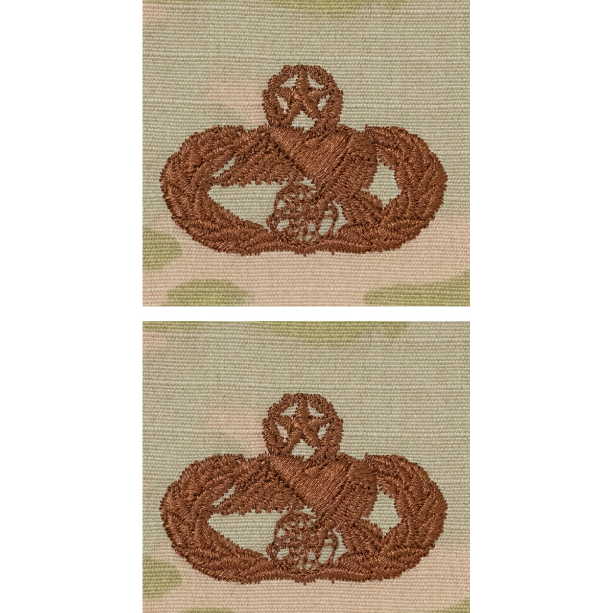 Air Force 3-Color OCP uniform master transportation badge embroidered. Authorized in 1993 and awarded to officers in the transportation career field and to enlisted personnel in the marine transportation and vehicle maintenance career fields.