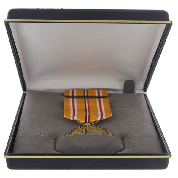 Full size medal presentation set for the American Defense Service (ADSM) Award. The set includes a full size medal and ribbon unit mounted on a single base bar with clutch backs in a presentation case. Priced per set. Please allow an additional 7-10 days for production.
