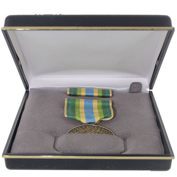 Full size medal presentation set for the Armed Forces Service Award (AFSM). The set includes a full size medal and ribbon unit mounted on a single base bar with clutch backs in a presentation case. Priced per set.
