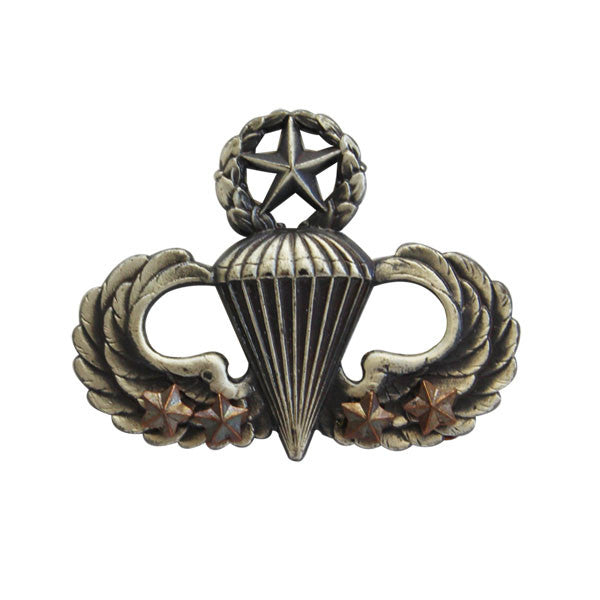 Army badge: Regulation size: oxidized metal finish: master combat parachute 4th award - each.