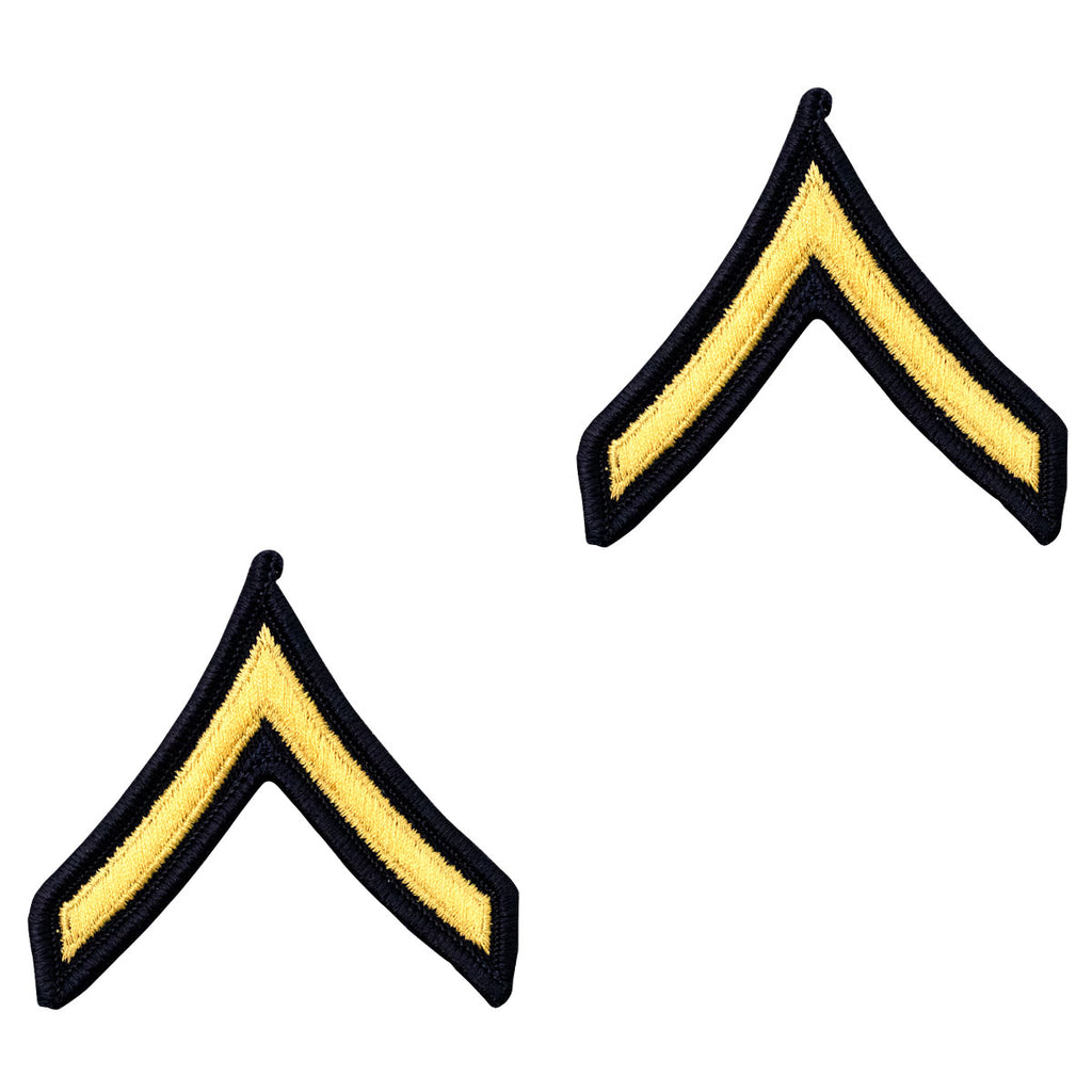 Army chevron rank: small (female size): gold embroidered on blue: Enlisted: Private (E-2 / PV2 / OR-2) - Price per pair.