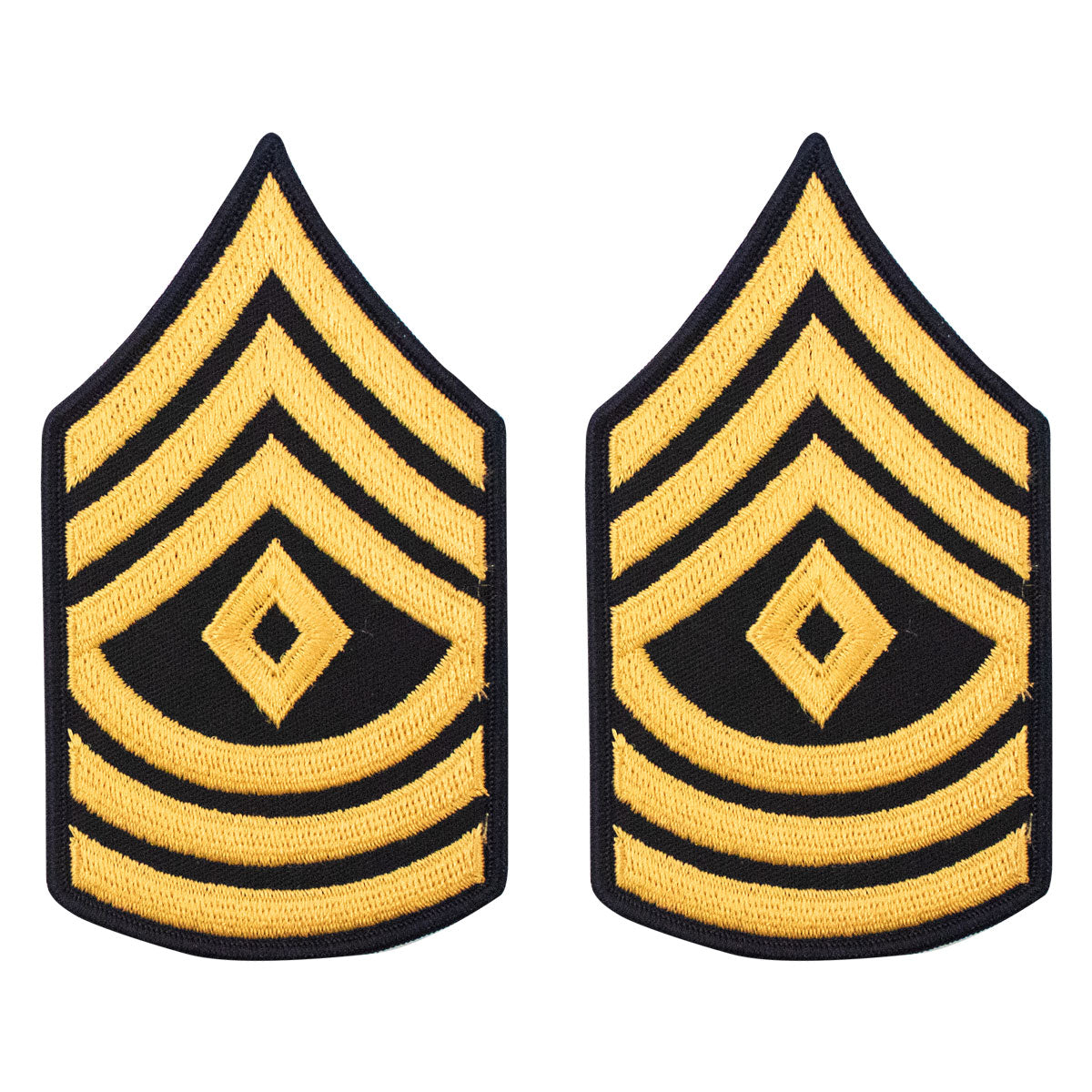 Army chevron rank: large (male size): gold embroidered on blue: Enlisted: 1st Sergeant (E-8 / 1SG / OR-8) - Price per pair.