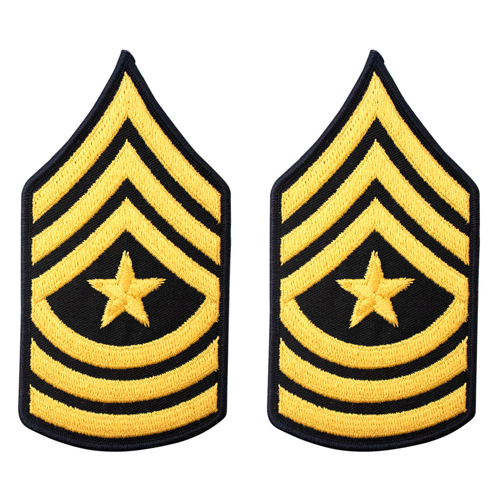 Army chevron rank: large (male size): gold embroidered on blue: Enlisted: Sergeant Major (E-9) - Price per pair.