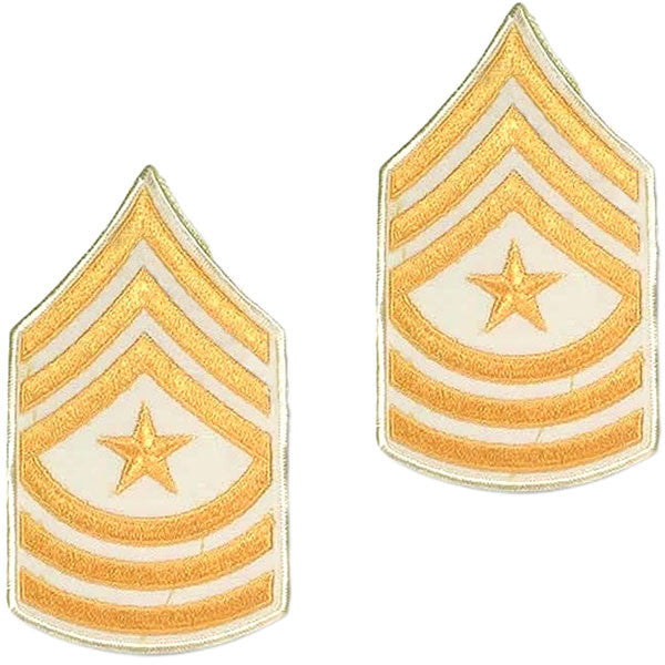 Army chevron rank: large (male size): gold embroidered on white: Enlisted: Sergeant Major (E-9) - pair.