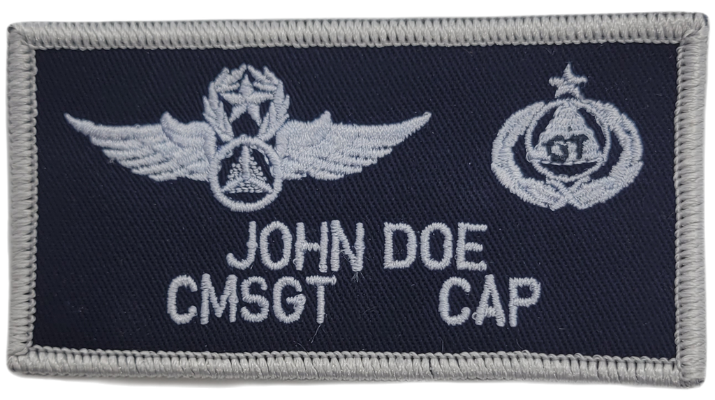 Dual emblem blue cloth name patch with silver embroidery, 2" x 4" with hook. This item is personalized with two CAP aviation badges or duty title, First and Last names are required (middle initials are allowed) (nick names or flight call signs are not authorized), rank for NCOs only. (Military Insignia, NOT Authorized). Senior Member Officers will choose NO RANK.  Anything entered in the Mission Quals box will appear as wording for the duty title. All cadets will use the rank CADET.  Custom and personalized items will take an additional 9-14 working days.