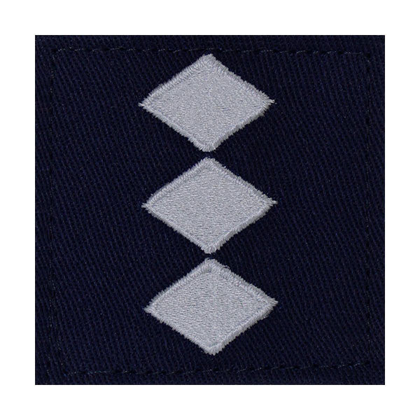 Cadet colonel cloth insignia fleece rank embroidered in silver on dark blue background with hook. Made for wear on the fleece and the OCP uniform. For cadet officers.