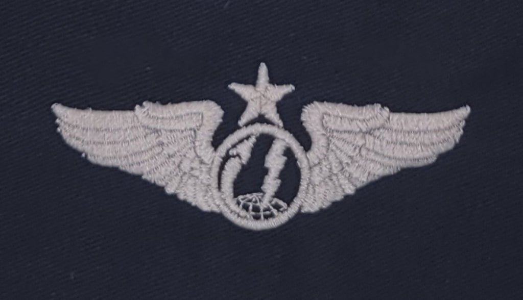 Air Force senior Remote Pilot cloth wings embroidered in silver on dark blue background. For wear on BDUs, ABUs and cap field uniform.