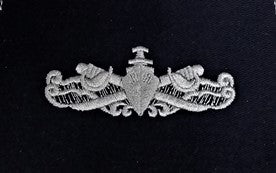 Navy Enlisted Surface Warfare cloth badge embroidered in silver on dark blue background. For wear on BDUs, ABUs and CAP blue field uniform.