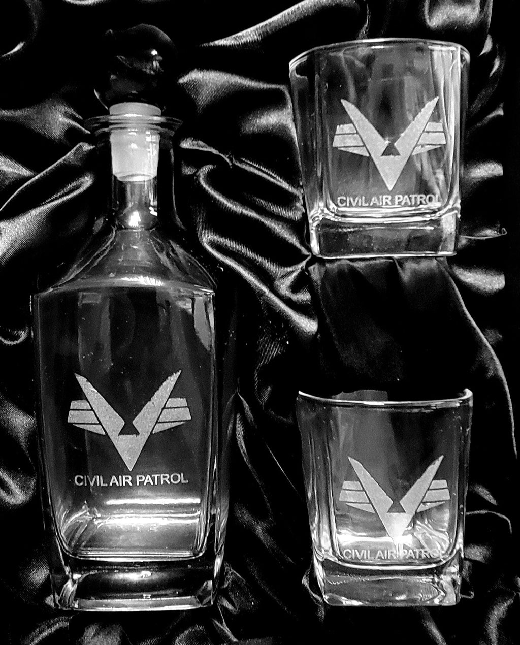 Civil Air Patrol: Glassware CAP Liquor Decanter set with etched logo. 1 Liquor Decanter and 2 glasses.