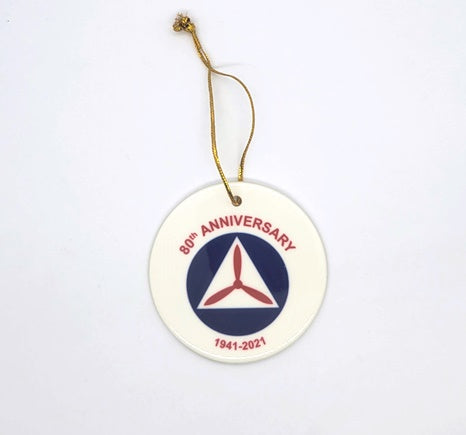 Civil Air Patrol Holiday Ornament for 2021. White ceramic ornament featuring the Civil Air Patrol triangle red propeller within the ornament. Size: 2 3/4" round.