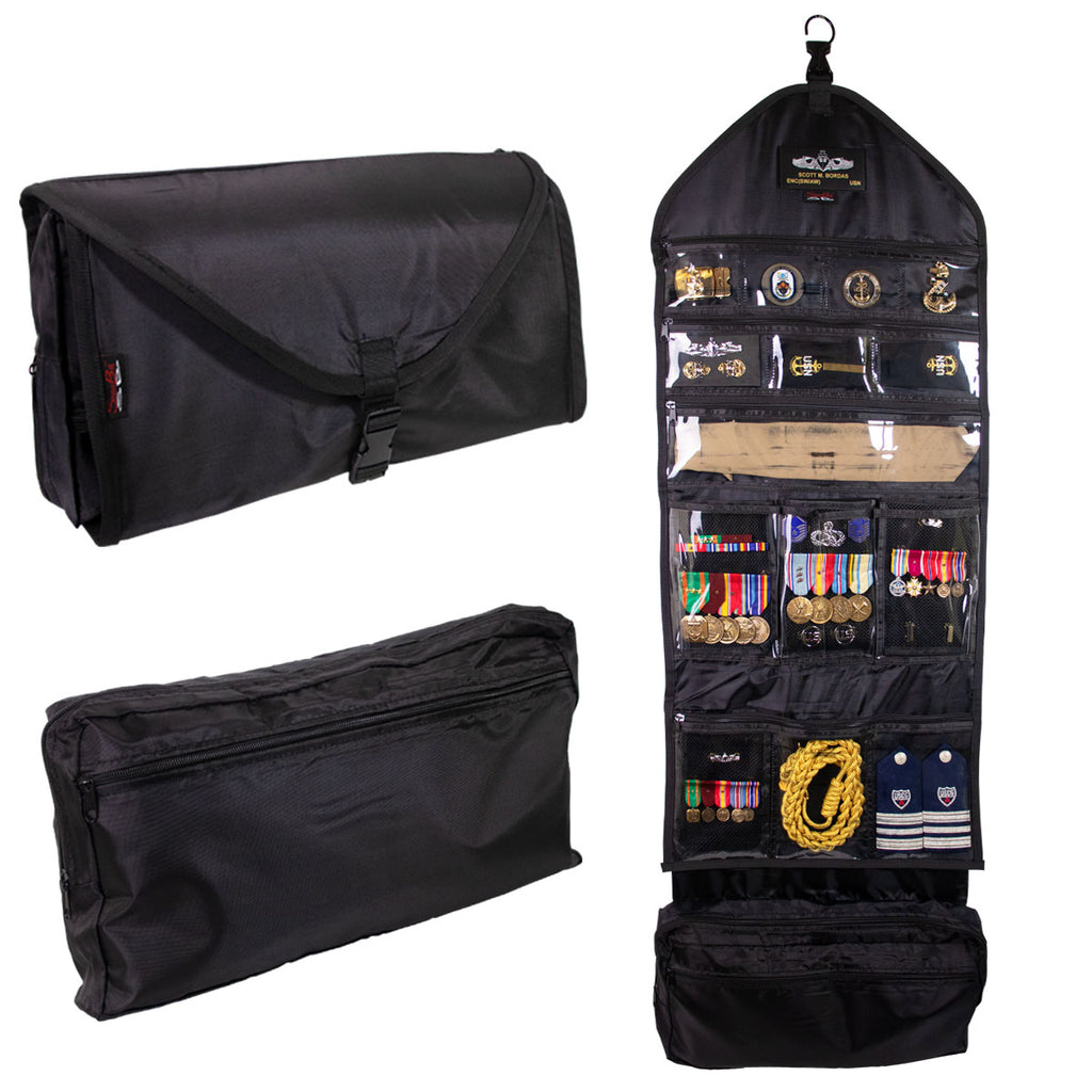 Insignia Bag (large) is black. It has a front flap with a release pack buckle closure and is 37.5" long X 15.75" wide. This bag features a polyethylene board inside bag to maintain shape, clear pockets make it easy to inventory uniform items, neatly organized layout, interchangeable medal pinning flaps with fleece backing, folds to compact portable size, protective pouches allow storage of a variety of items, made form durable, tear resistant material reinforced seams and swivel hook to hang from any position for easy access.