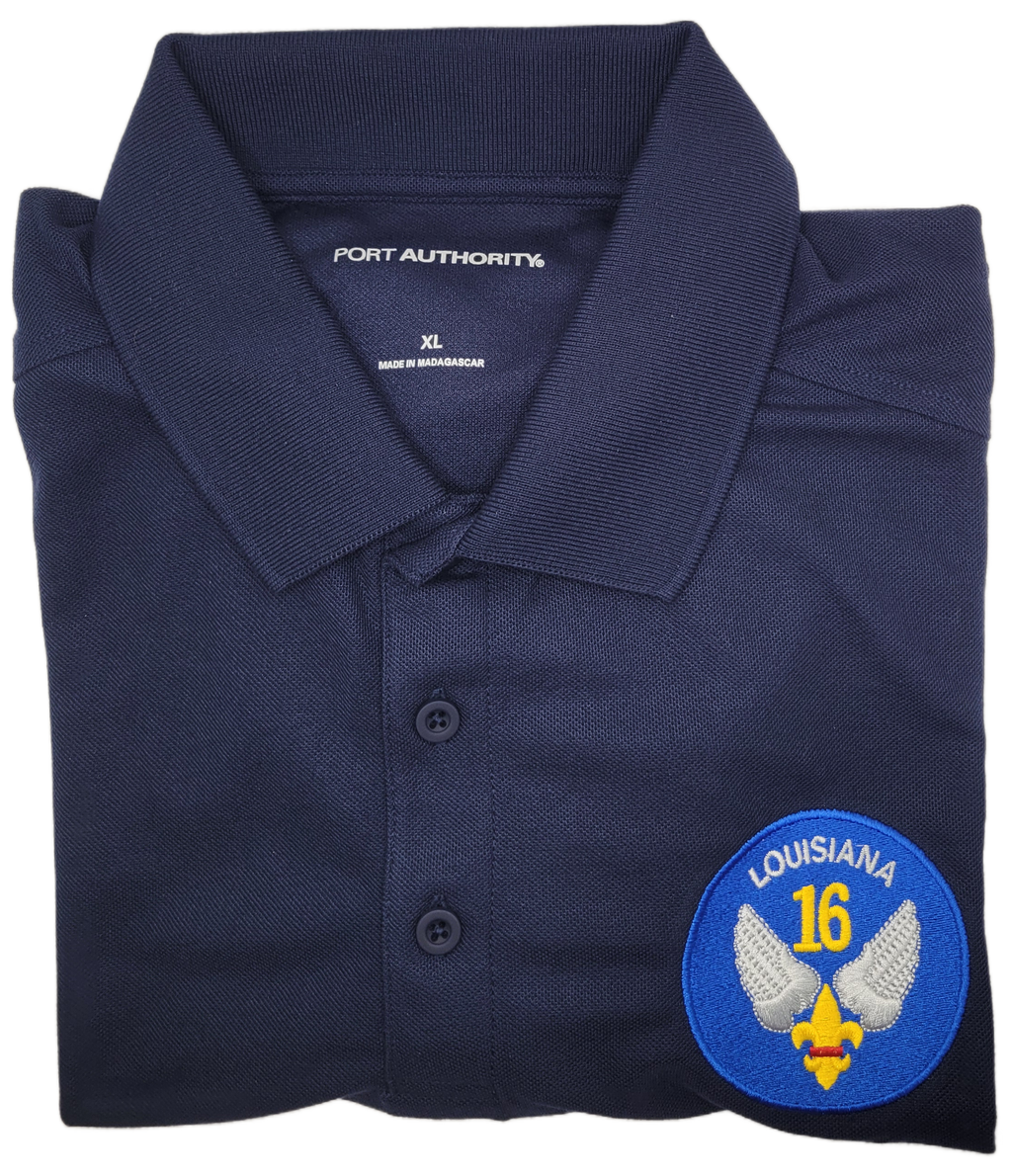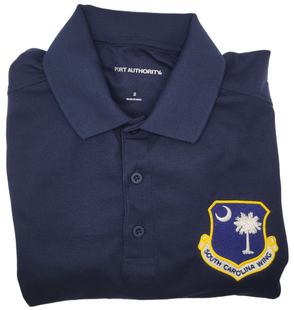 CAP Leisure polo, navy blue, male short-sleeve shirt with Personalized embroidered Wing or Region patch on left chest side for the shirt. Personalized ball caps will take and additional 10 - 14 business days.  No returns, no refunds, no exchanges. Please choose your size.