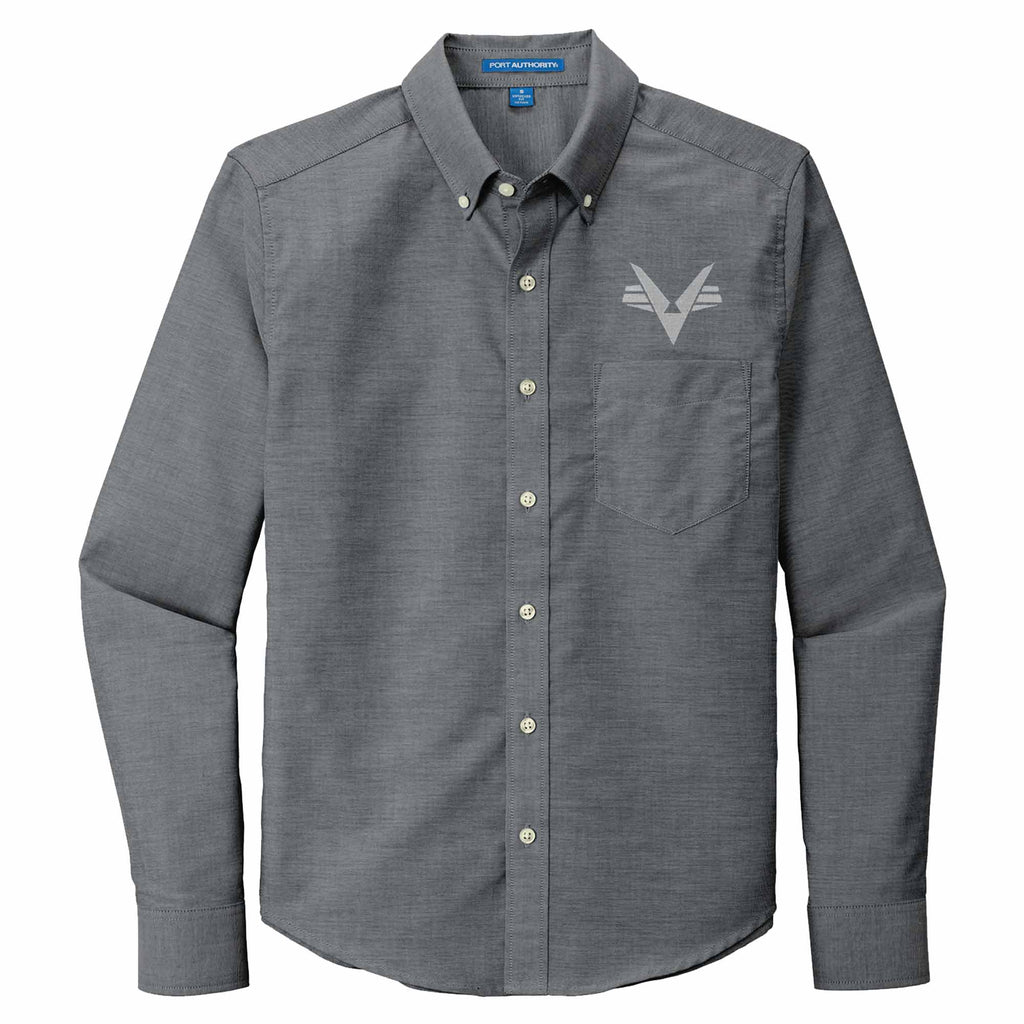 CAP shirt, black, male long-sleeve leisure shirt with embroidered Flying V and Civil Air Patrol on left chest side of the shirt. Look your best in a tried-and-true oxford that performs. This shirt is 4.6 ounces, 60/40 cotton/poly, has back shoulder pleats, pearlized buttons, button-down collar, left chest pocket and rounded adjustable cuffs. This is not a uniform item. Please select a size.