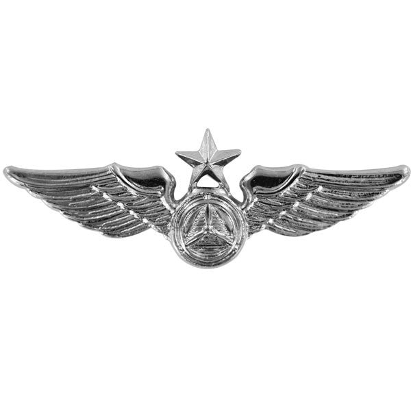 Senior observer wings bright finish miniature wings. Worn on the Air Force blue epaulet shirt, overblouse, and cap white aviator shirt.