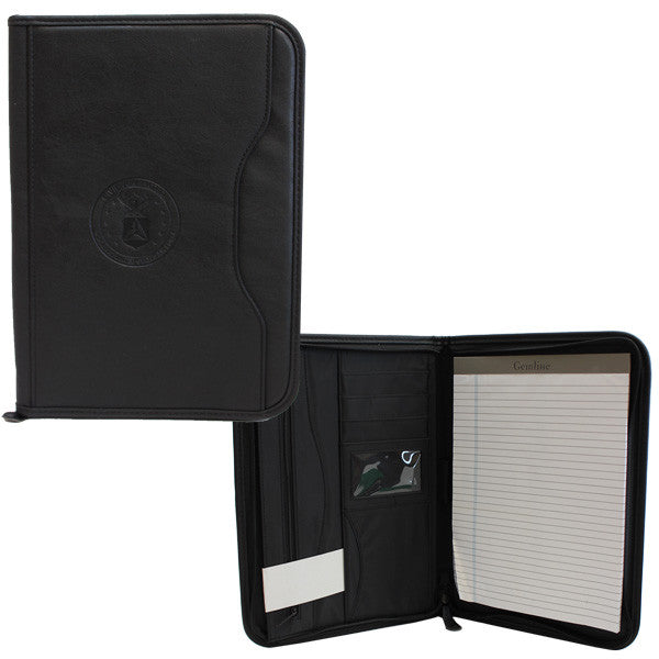 Black zippered pad folio with Civil Air Patrol seal embossed on cover. Front cover has pocket. The inside contains one note pad, a pen holder, three slots for cards, one slot for identification, one cd holder, a brochure pocket, one zippered pocket, and one full size pocket.