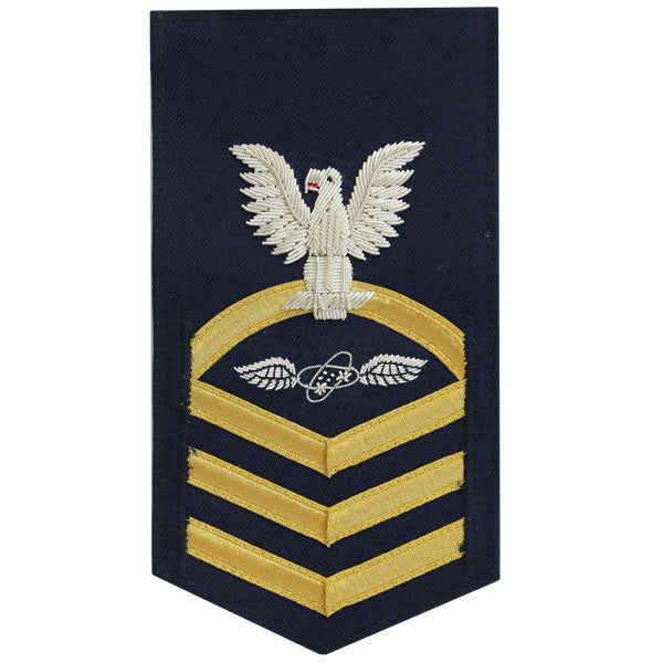Coast Guard rating badge E-7 Vanfine bullion eagle and shield with gold lace chevrons on blue - individually priced. Please allow 2-4 weeks for delivery.