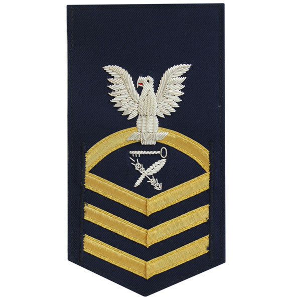 Coast Guard rating badge E-7 Vanfine bullion eagle and shield with gold lace chevrons on blue - individually priced. Please allow 2-4 weeks for delivery.