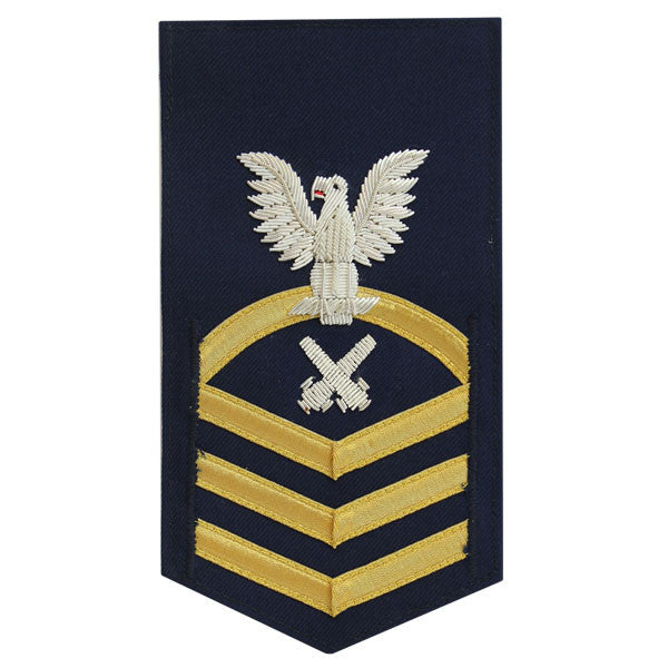 Coast Guard rating badge E-7 Vanfine bullion eagle and shield with gold lace chevrons on blue - individually priced. Please allow 2-4 weeks for delivery.