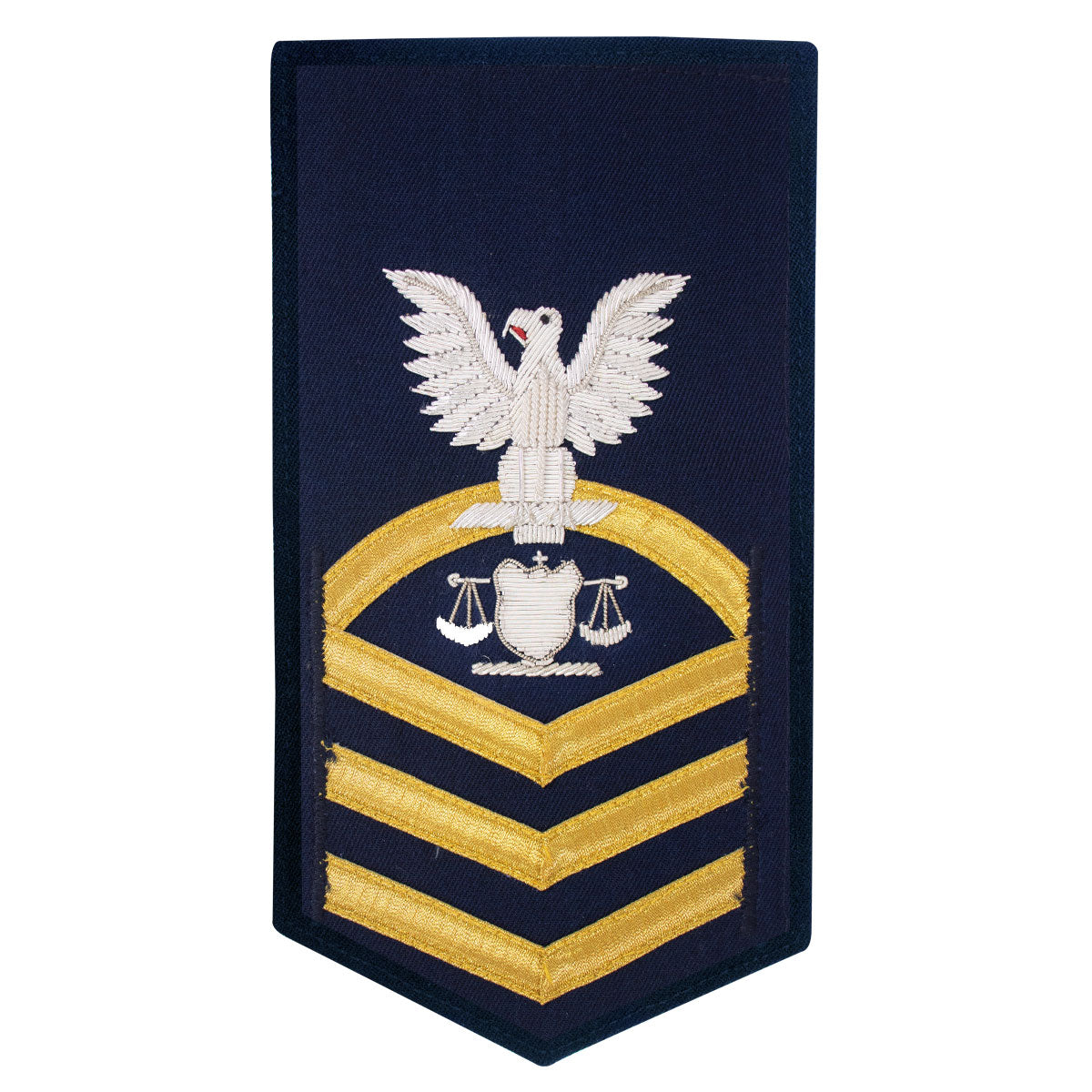 Coast Guard rating badge E-7 Vanfine bullion eagle and shield with gold lace chevrons on blue - individually priced. Please allow 2-4 weeks for delivery.