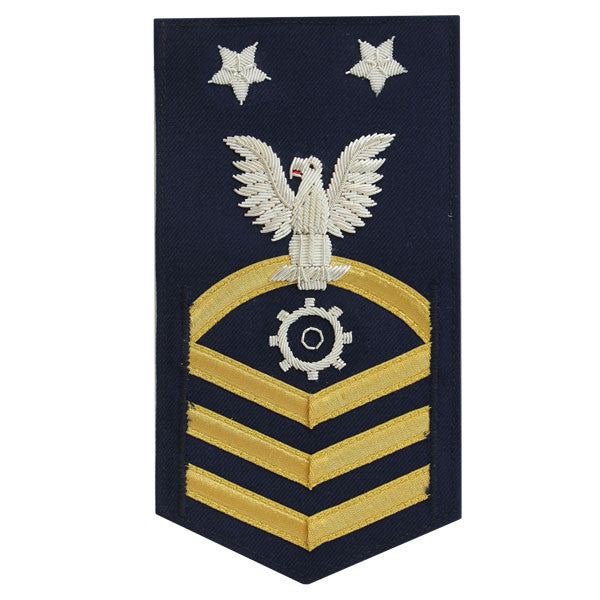 Coast Guard rating badge E-9 Vanfine bullion eagle and shield with gold lace chevrons on blue - individually priced. Please allow 2-4 weeks for delivery.