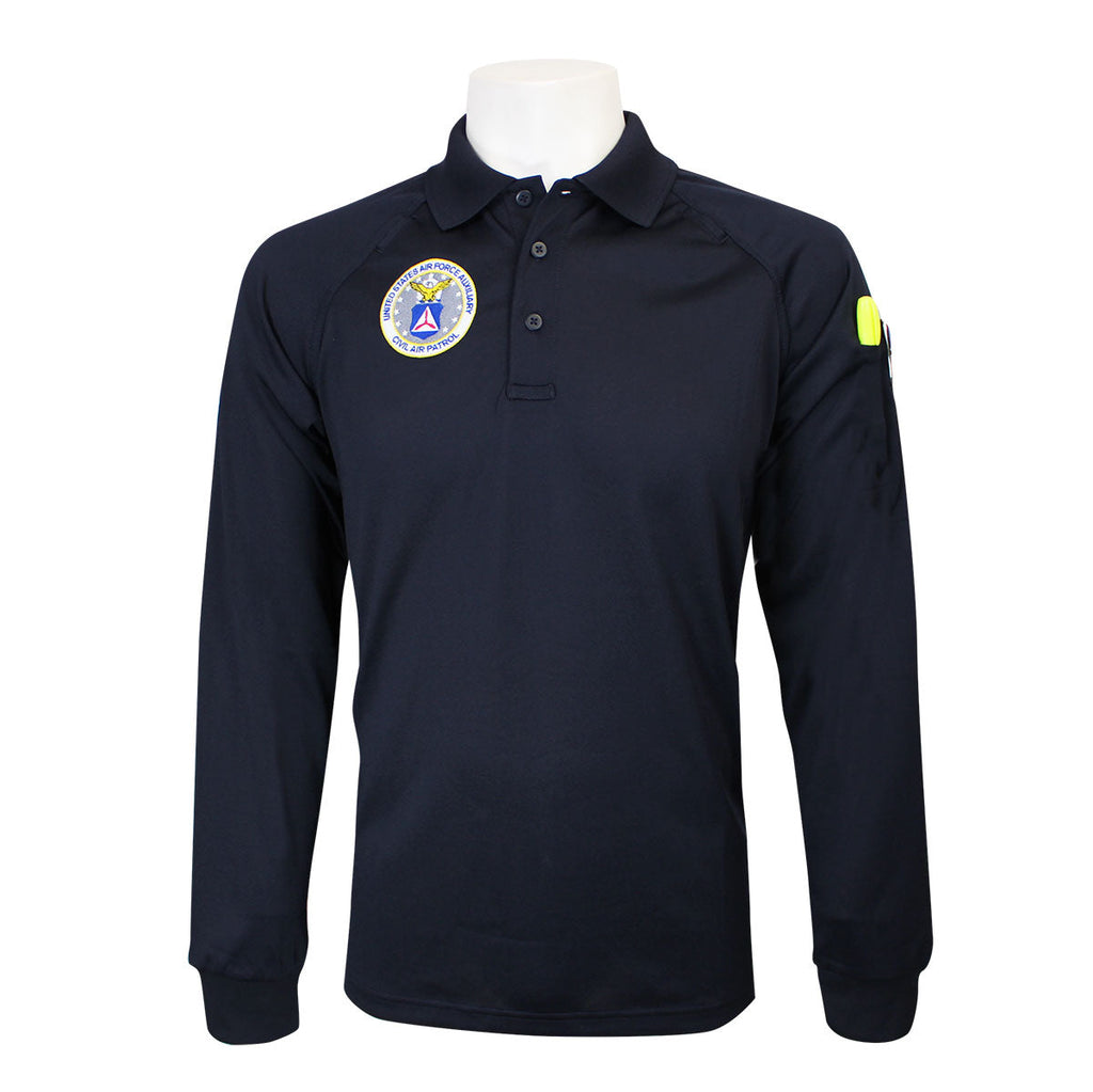 Male long sleeved blue tactical golf shirt, a.k.a. corporate working uniform shirt, with Civil Air Patrol (CAP) seal embroidered in full color on right side. With strategically placed mic clips and dual pen pockets. Built for performance, this snag-proof, moisture-wicking, odor-fighting shirt will keep you sharp and professional-looking. 6.6-ounce snag-proof 100% polyester, Double-needle stitching throughout, Tag-free label, Flat knit collar, 3-button placket with dyed-to-match buttons, Mic clips at center placket and shoulders, Raglan sleeves, Reinforced dual pen pockets on left sleeve, Side vents, and Drop tail to stay tucked in.