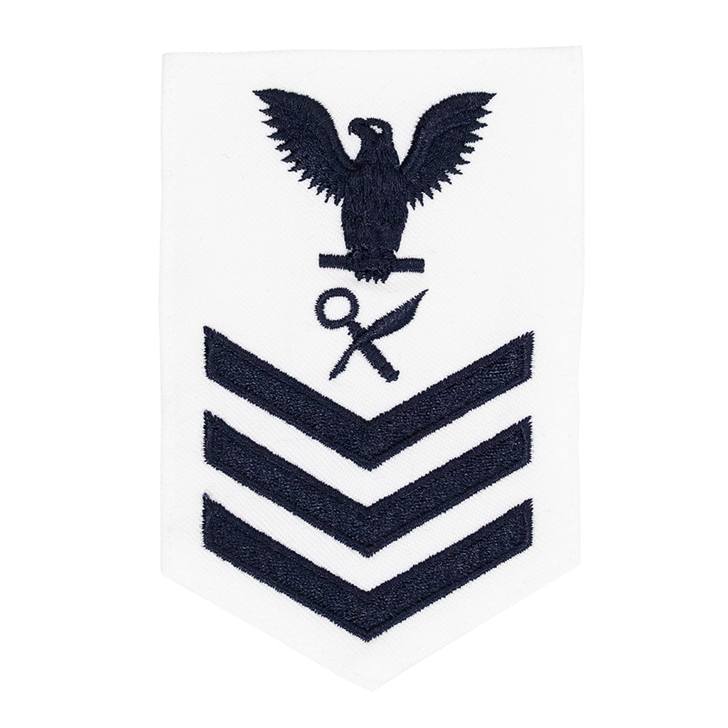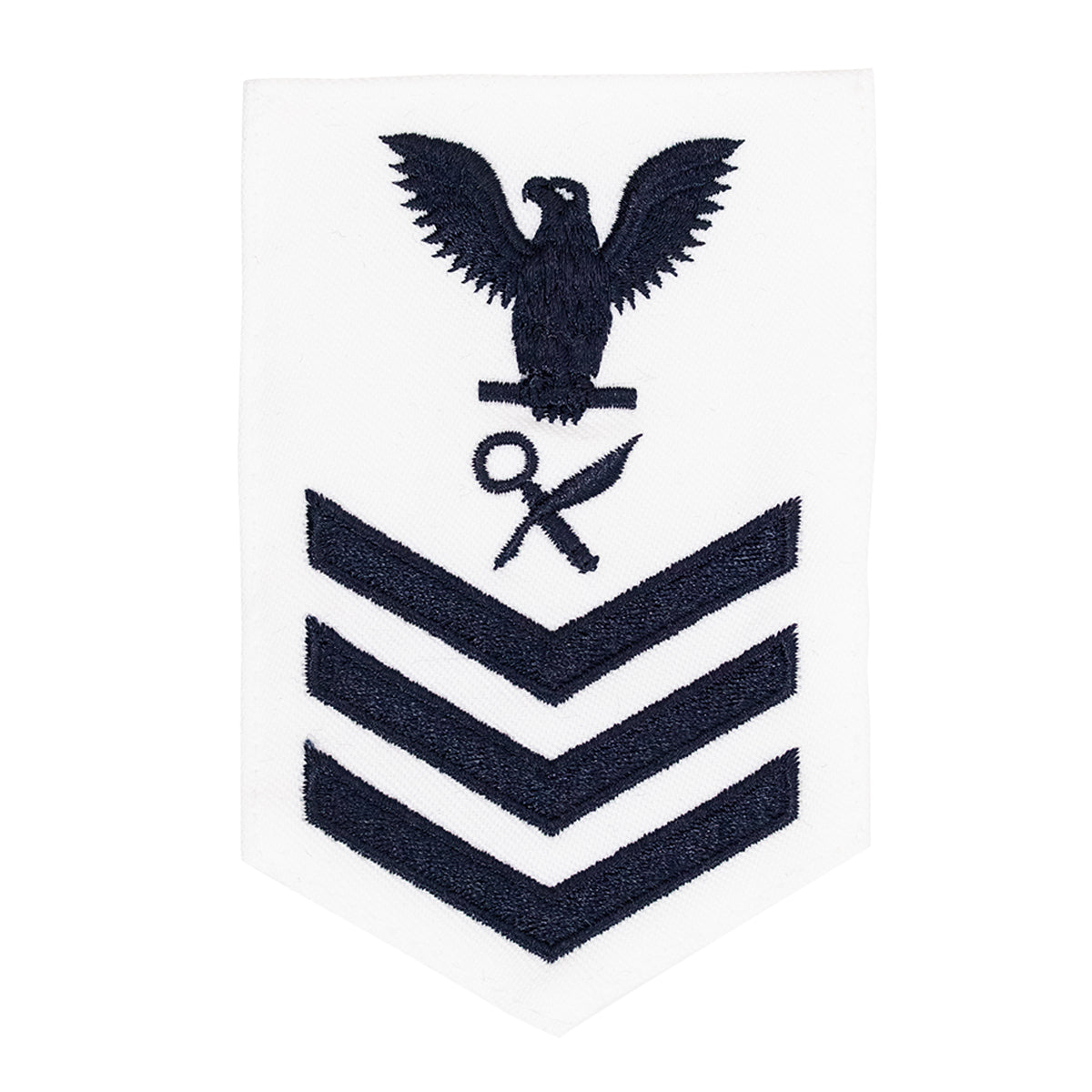 E-6 Intelligence Specialist (IS) white Navy Female rating badge.