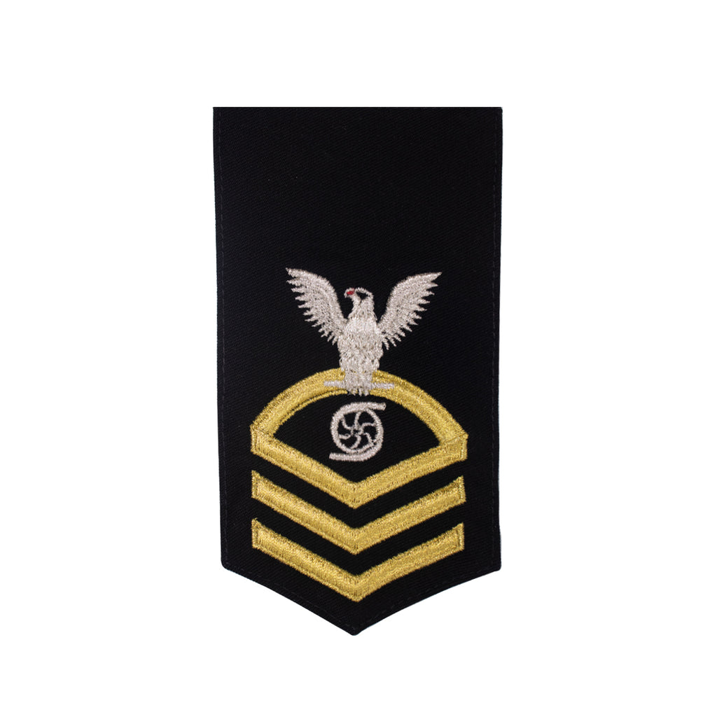 Navy rating badge E-7 seaworthy-all machine made eagle and center with embroidered gold embroidered on blue GS Gas Turbine System Technician.