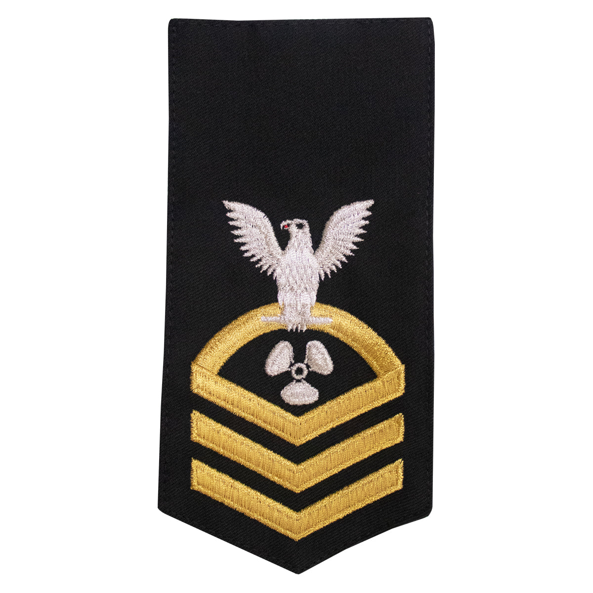 Navy rating badge E-7 seaworthy-all machine made eagle and center with embroidered gold embroidered on blue MM Machinists Mate.
