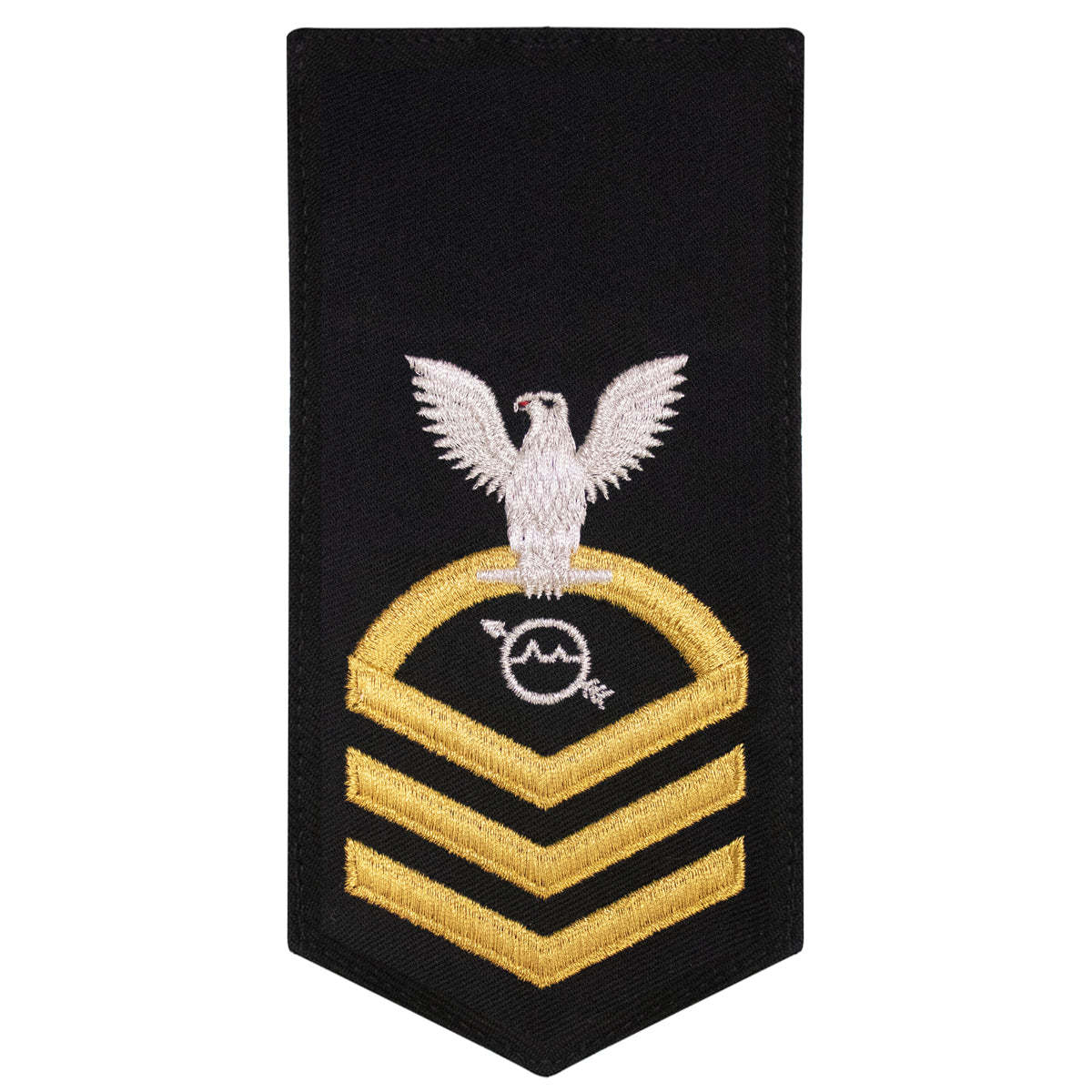 Navy rating badge E-7 seaworthy-all machine made eagle and center with embroidered gold embroidered on blue OS Operations Specialist.